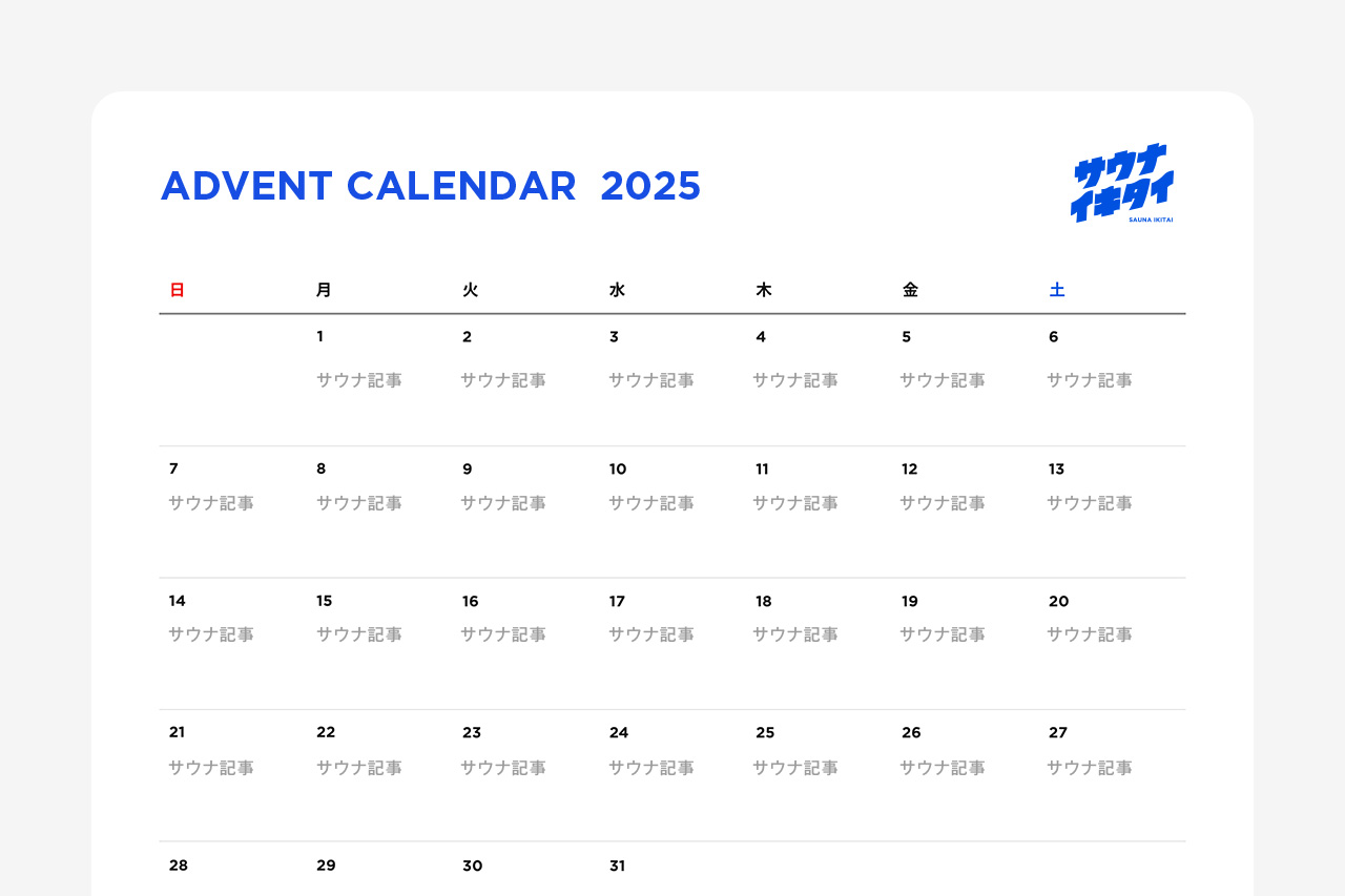 今年も12月1日から25日まで、ユーザーさんが日替わりで執筆するサウナ記事を毎日公開します。毎年個性豊かなサウナ記事が公開されるのでお楽しみに!