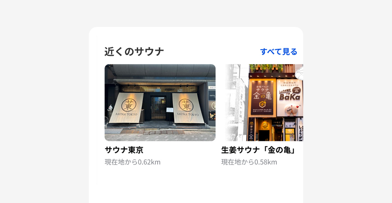 現在地周辺のサウナ施設が写真付きで表示されます。「こんな近くにサウナがあったんだ!」という、新しい発見があるかもしれません。