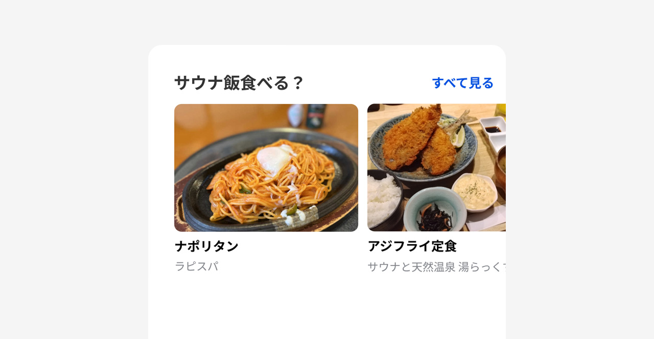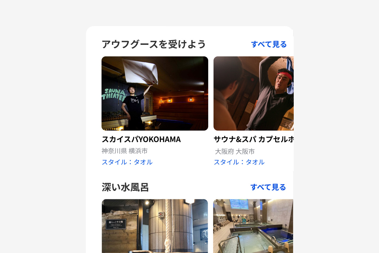 新しくなったホーム画面では、アウフグースや深い水風呂など、テーマごとの施設紹介をはじめ、現在地周辺のサウナ情報やサウナ飯、水風呂動画など、様々な切り口のサウナコンテンツがずらっと並んでいます。ただスクロールしているだけで広くて深いサウナの世界に自然と誘われるような、見ているだけでも楽しい発見があるホーム画面を目指しました。