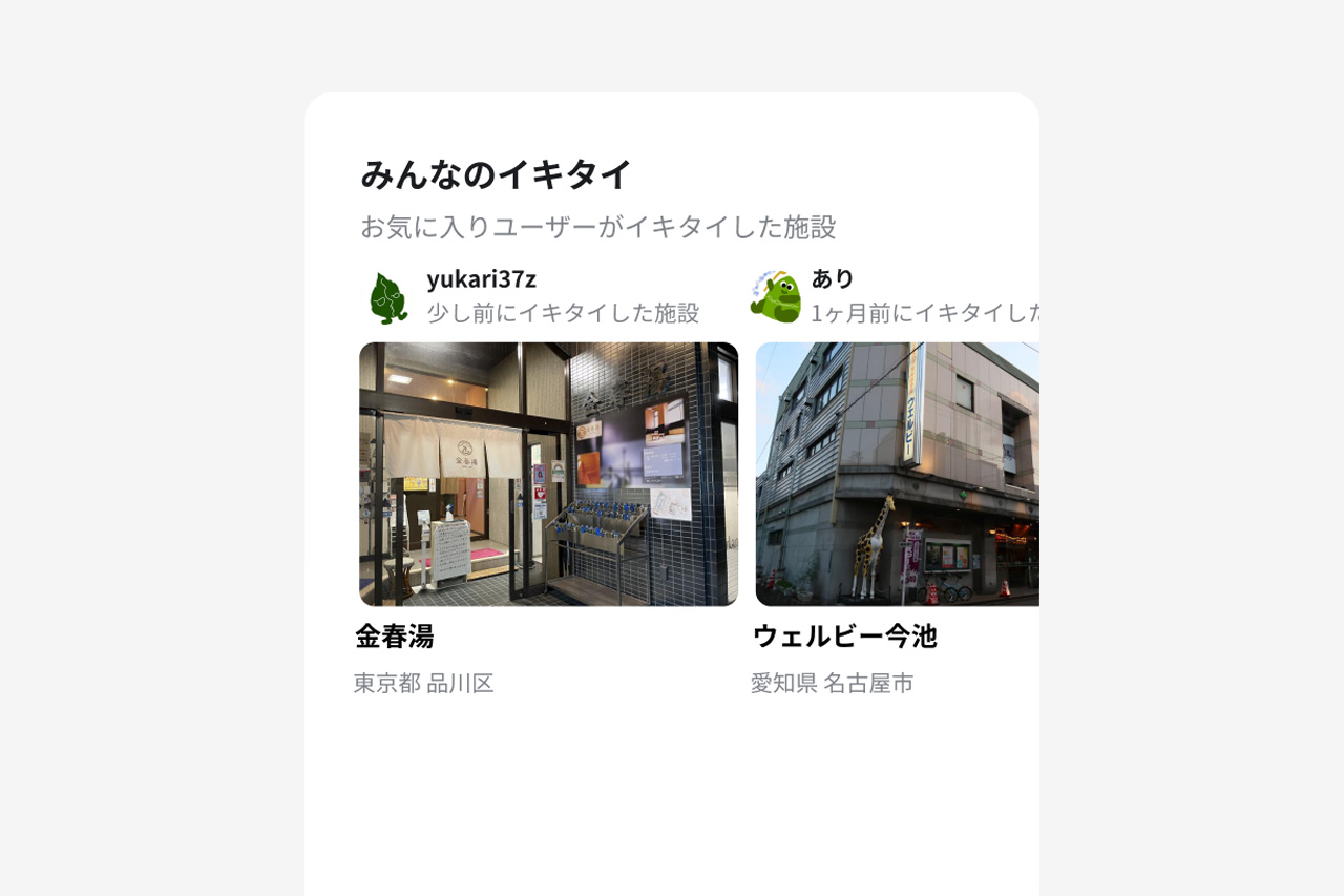 お気に入りユーザーがイキタイしている施設をチェックすることができます。 好みの近いユーザーさんをお気に入りしておくと、気になるサウナがどんどん見つかるかも?ふだんのサ活で好みの似ているユーザーさんを見つけたら、ぜひ「お気に入り」してみてください。