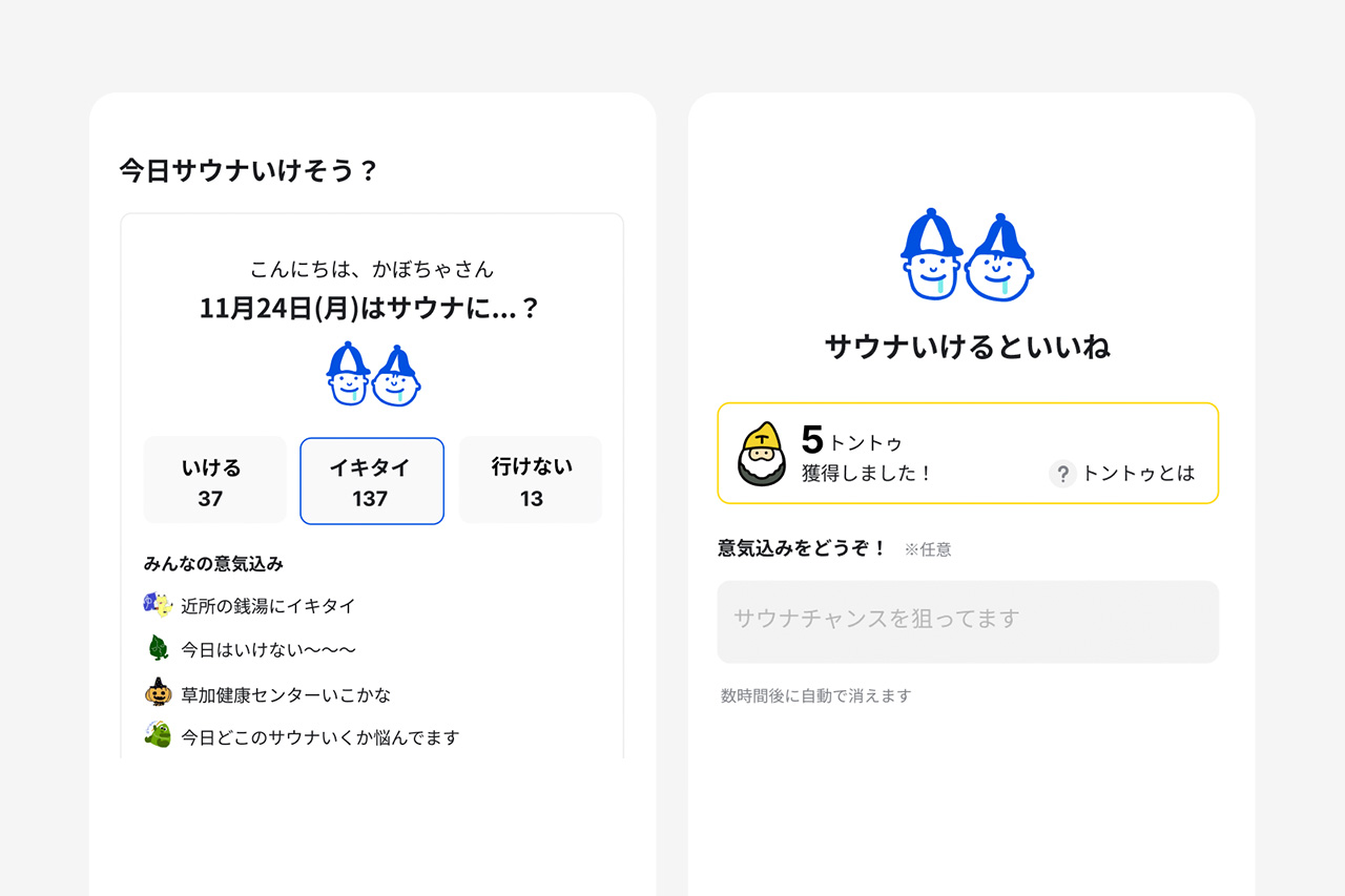 今日サウナにいけそうか投稿できる機能です。1日1回だけ投稿できて、回答するとトントゥがもらえるので、気軽に投稿してみてください。今日のサウナへの意気込みは数時間で自動的に消えるので、今の気持ちをサクッとつぶやいてみてくださいね。