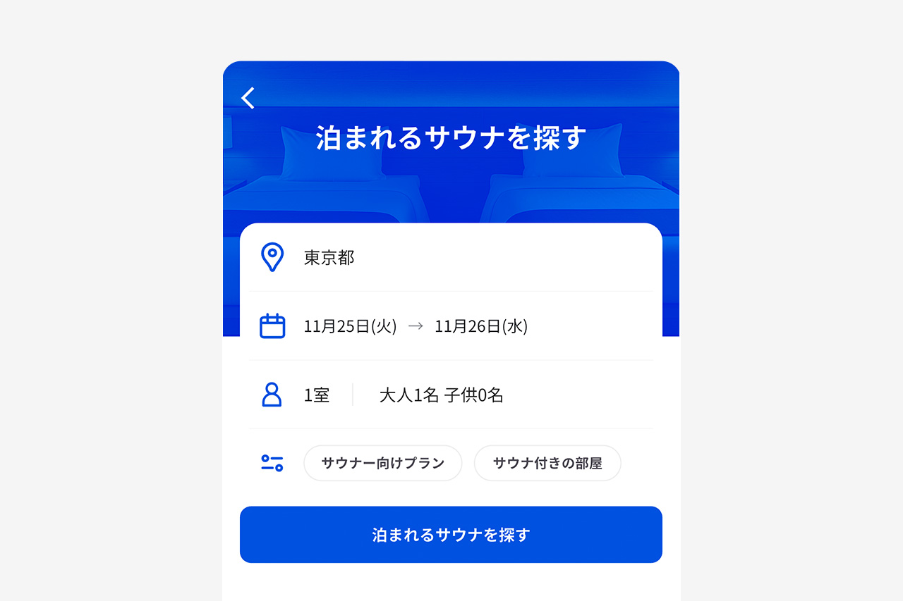 新しいホーム画面では「宿泊」ボタンから、簡単に日程や宿タイプで泊まれるサウナを探せるようになりました。例えば 、11月20日から1泊、大人2名でサウナ付きの部屋に泊まりたい、といった条件をサウナイキタイ内で検索することができます。 とっても便利に泊まれるサウナ探しができるようになったので、サウナ旅や出張が多いみなさん、ぜひガンガン使ってください!