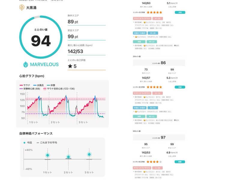 お湯が柔らかく、薄暗いサ室はラベンダーアロマで瞑想。冷たい水風呂で冷やされ、外気浴で最高のととのい。