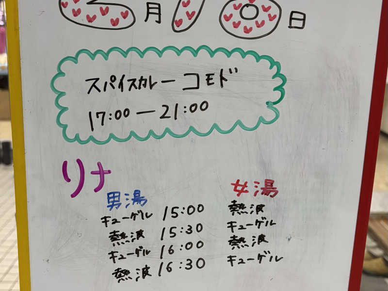 サウナは、木の良い匂いがします!若い方もたくさんおられましたが、ボスのようなおばさまの視線が少し痛い...🥲水風呂との相性は抜群で整うとはこのことだ!!!とハッピーな気持ちに!露天風呂も行きましたが雰囲気あり最高。ただ、行ったのが23時台で暗さが気になる、、、。