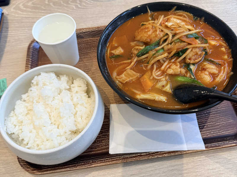 お腹ぺこぺこ過ぎて先にご飯を。ピリ辛モツラーメンとライスからの温泉&サウナへ。