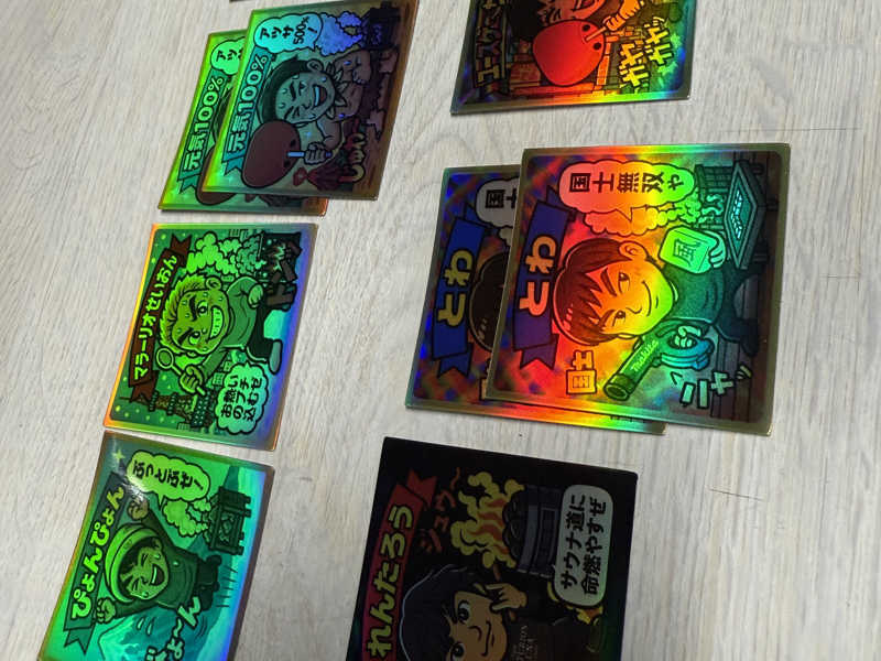 本日は1時間半のサ活で終了♨️帰り際にまたまたリフレ熱波師シールを3組購入🔥シールの中身を確認したら9枚ともカブリ😱なかなかカッシーとぺぺシールが出て来ない…😱レアキャラなんだろうか…⁉️😱