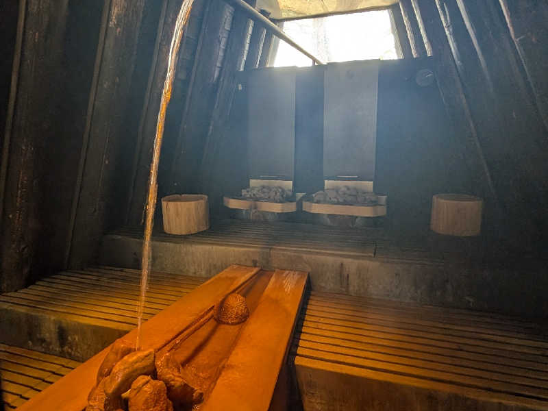 入浴はまず体をお湯で流すのだが、そのお湯がほぼ50度くらいの源泉、ダチョウ倶楽部気分を少し味わってから、135センチの立ち湯で温泉を堪能し、そこからサウナへ、流れ続ける源泉で湿度も十分だが、そこにさらに水道水によるロウリュも可能、100度ほどのサウナで既に熱いが、さらに熱気を増すことができる。十分暖まったら水風呂へ、水風呂は地下水で、春の今の時期で8度ほど、冬には1度になることもあるとか、落ちてくる水に当たり続け、修行者気分を味わうこともできる。