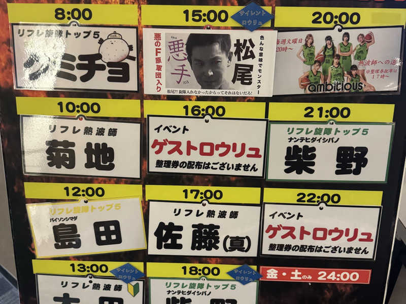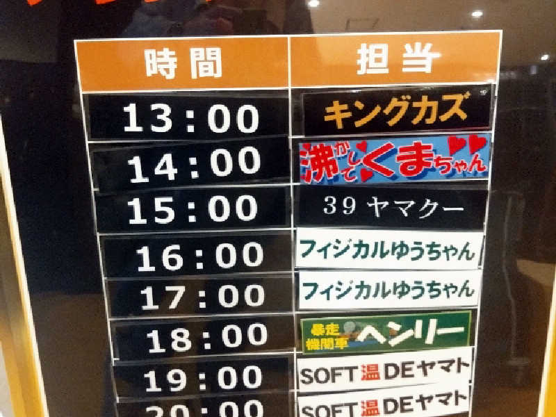 16時は「フィジカルゆうちゃん」師。月に4回ほど登場する本業はchiropractorのマッチョな兄貴。アロマ水はほうじ茶にレモングラスを配合。暗転した超満員のサ室でメロ―なR&Bから、ラテンR&Bなど徐々にアゲアゲ。12分と短い時間で仕上げるナカナカの腕前。グルシン水風呂でク―ルダウン。