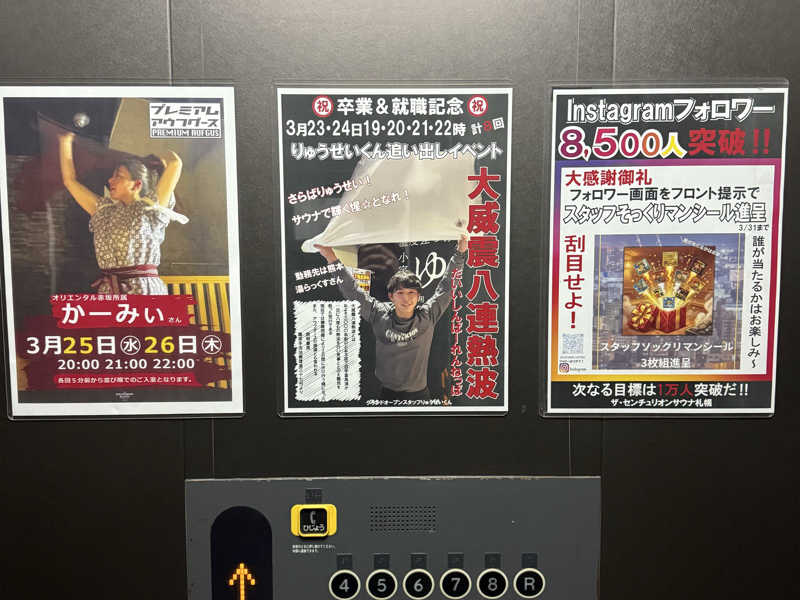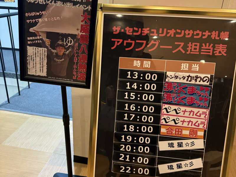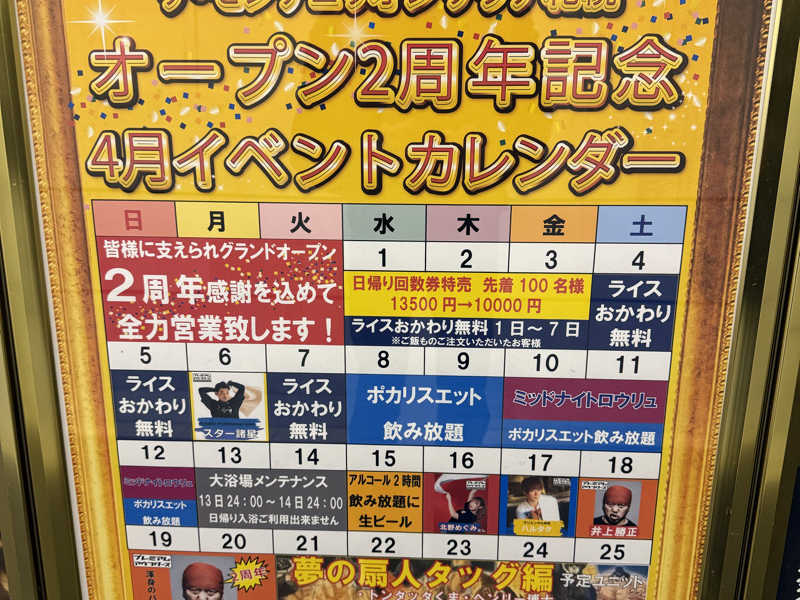 本日は午後半休🎌18時半からの用事前に一汗♨️残念ながら昨日と今日の琉星君の追い出し八連熱波は参加できず😱せめて罪滅ぼしにセンチュリオンへ♨️エントランスに入ると4月のイベントカレンダーが🗓️2周年月間なのでイベント盛りだくさん🥳コレは楽しみ🎶♨️