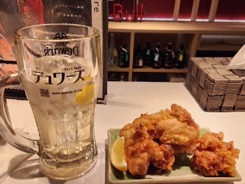 ロウリュが終わった後のサウナに入り、朝食兼昼食のメガハイとザンギをカウンターで。
