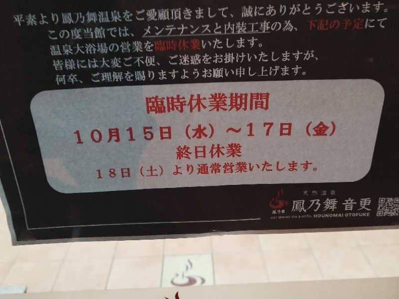 地元客が多め、温度湿度はいい感じ✌️いい汗出ます💦💦💦からの水風呂13.0℃は最高😊😊😊洞窟風呂にお湯は入ってないだけで外気浴は完璧👍近隣の山々の紅葉が色付き初めてめちゃキレイ😍😍😍涼しげな風を浴びて気持ちいいー😵💫😵💫😵💫地元客の話を盗み聞きしポンプ故障が原因らしい😮💨以前ジャグジー不調の時は9ヶ月もかかったらしいですゆ😤😤😤ジジたち怒ってましたわ🤭