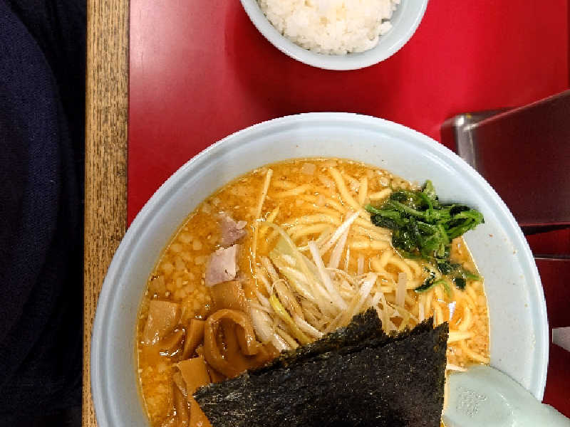 サウナ後フロント前で記念撮影&おしゃべり気づいたら11時過ぎで急いでチェックアウト😅サ飯は山岡家の特味噌ネギラーメン