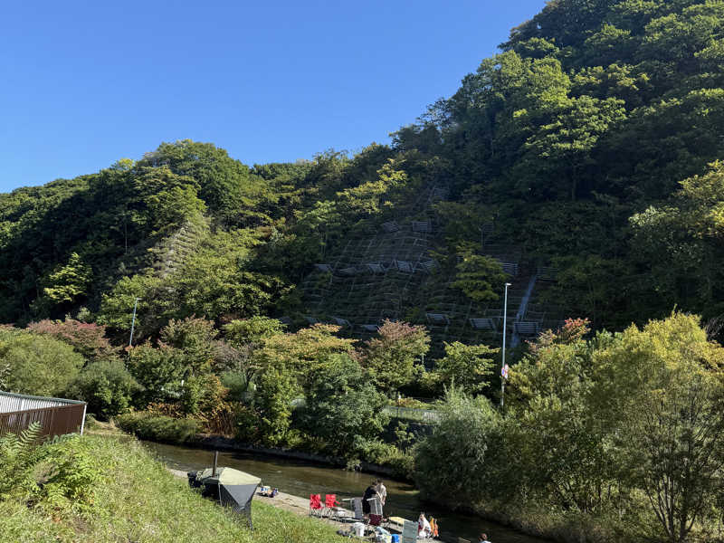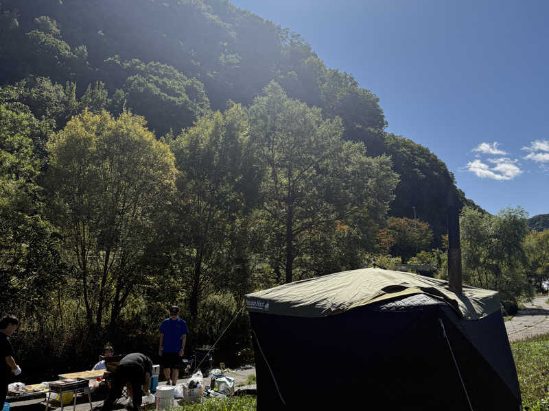 現地に到着すると発寒川のほとりの河岸にバーベキューコーナーとテントサウナが設置されている❗️😮テントサウナの煙突からは薪の焼けるいい匂いが☺️🔥パックには山々の緑🌲最高のロケーション😆✨♨️すでにスハラさんがビールでブーストアップ中⤴️🍺