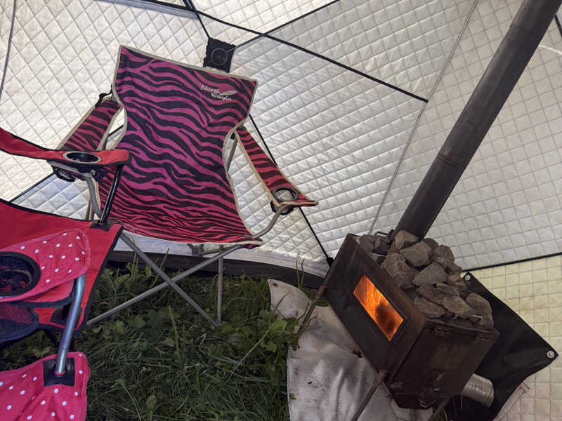 そしてお目当てのテントサウナへ🏕️🔥入るとまず熱気がすごい🔥😮そして薪ストーブの音と匂いが良い🔥☺️室温は100℃超え🔥ロウリュもやっているので湿度もある🔥入って1分もしない内に大量発汗☺️💦そしてサウナストーンにロウリュすれば一気に室温は上昇⤴️🔥コレは気持ちがいい😆💦途中サカスさん選りすぐりのアロマ投入やアウフグースもあり❗️🔥☺️たくさんいい汗かいた😆💦