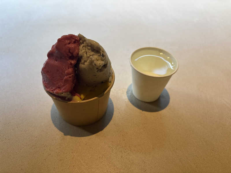 まずはこの辺りのヌシ、まさぞーさんのサ活に倣って道の駅おんねゆにて白花豆ソフトクリームを食べ、せっかくなので山の水族館も見学
