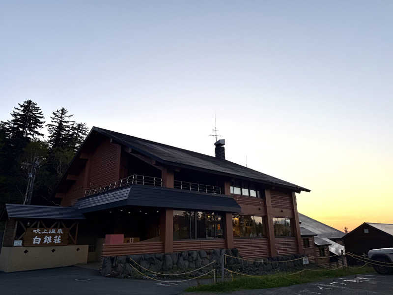 静岡からやってきました『北の聖地・白銀荘』静岡から札幌・旭川経由で途中、上富良野神社でお守りを購入し到着。いやー!サウナイキタイでずっと見てた外観!笑。15:30くらいにinしたけど浴場はそれなりに混んでました。ただ…温泉メインのお客さんが多い印象でサ室はソロになるタイミングもあり快適!セルフロウリュウも特別なオイルやアロマは使ってないけど温度と湿度のバランスがめっちゃ良くて水風呂もトロトロで長居できるほど快適でした。何よりも外気浴よ!真っ青な空…白煙上がる十勝岳…幻想的なマジックアワー…心地良い外気温。浴場に広がるヒバの香りも最高ですわ。もう誰もいないベンチに仰向けで寝転んだら秒でぐわんぐわんなロケーション。