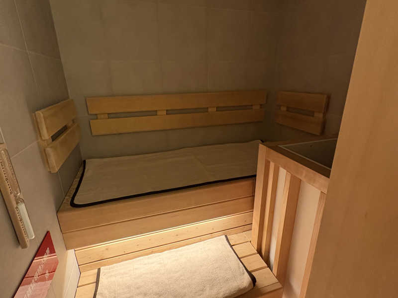 ウッドサウナは4段の広いサウナ室で、大人数も受け入れできるキャパシティを持ってます。オートロウリュを備えていますが、ロウリュなしでもなかなか高温で上段はかなり発汗できました。