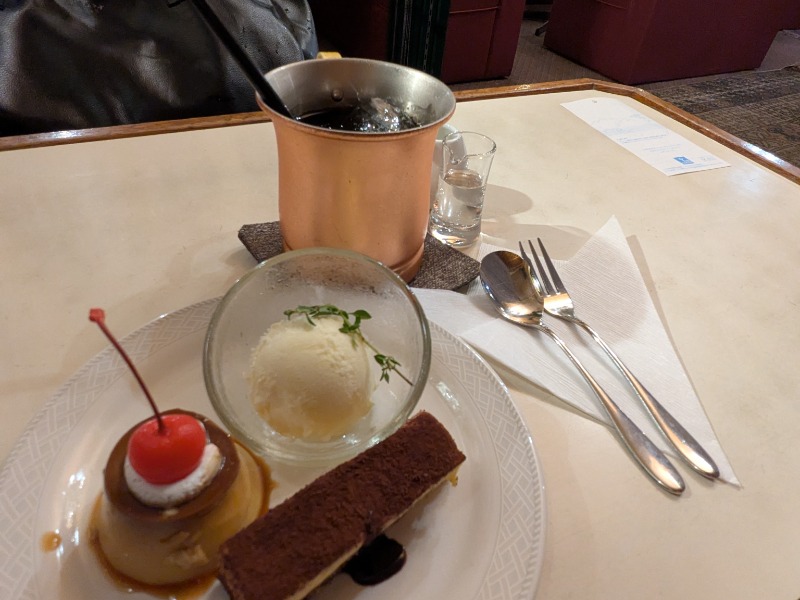小さめのデザートがいくつか乗ってくる。アイスコーヒーの入れ物は銅製。