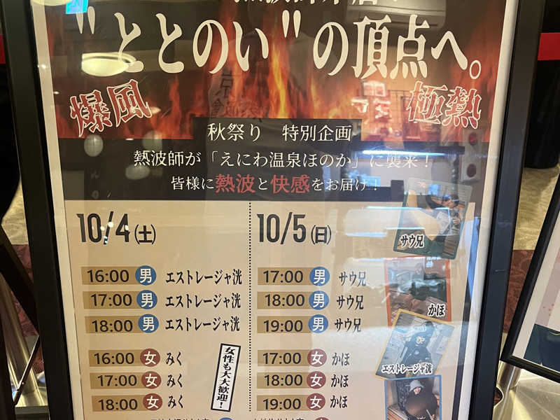 一言:仕事して、息抜きに3時頃にベアモンテさんへ。特に紅葉見に行くわけでもなく、晴れてたのでなんとなくきてみました🍁山も湖もキレイですね✨さてまずは内湯で湯通しです、サラサラして疲れたカラダに優しいです♨️露天あるのかと思ったら風呂はなく、サウナのための露天スペースなので、いざ露天サウナへ!キレイなつくりでL字2段です、ストーブはまあまあ大きく、ロウリュするとたちまちいい熱気に包まれます😆ロウリュして自分仕様にセッティングするのが良さそうです!クラシックの音が、よりサウナを集中させてくれます🧘十分汗かいたところで、動線が素晴らしい冷たい露天水風呂にはいり、インフィニティチェアでととのいます😌外は暖簾がかかって、山麓の素晴らしい森林浴の中ととのうことができました!続いて浴室内のドライサウナへ!ドライサウナと書いてるのに、ここもロウリュできます😆やはり自分仕様にセッティングし、いい汗かけます😀こちらはややせまく、少し古びた感じですが対比という意味でも味がありいいサウナだと思います!次にミストサウナに入ります!ミストがきてる時は気持ちよく入れますが、ミストが止まると少し物足りなくなり間隔もすぐにはきてくれずやや途方にくれます😅内湯にも水風呂があり、こちらは外よりややマイルドですがミスト後ならピッタリかもです!内気浴のサンラウンジャーで寝るのが、殊の外気持ちよく寝ちゃいました😴締めに露天サウナへ行って、満足な休日プチサウナ旅でした🙌あしたも頑張ろう!