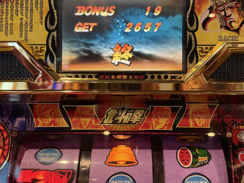 小役確定演出で小役揃わず、あっけなくラオウが登場してボーナス確定。しかし、僅か2連で敗退。