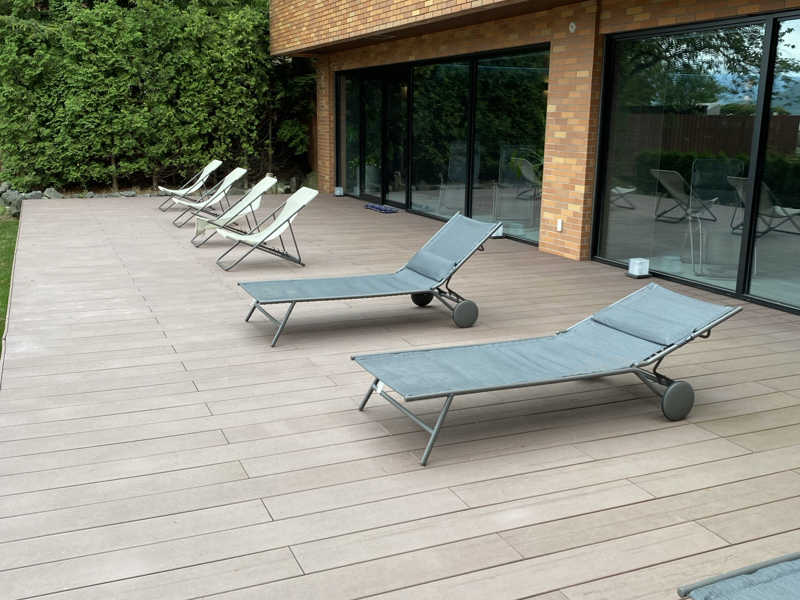 外気スペース専用部屋があり、4脚リクライニングのデッキチェアあり。