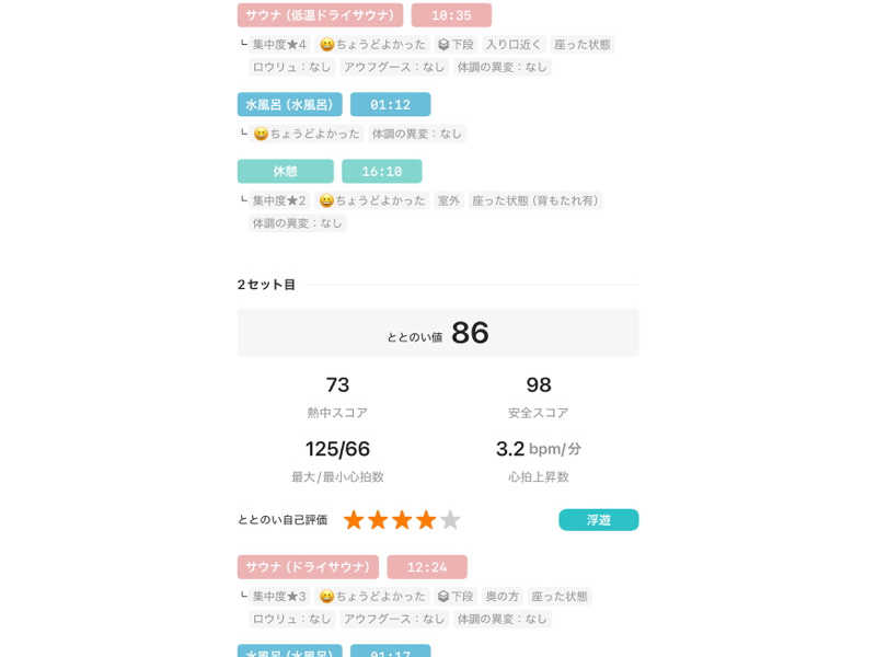 サウナ6分→水風呂50秒→休憩5分のサイクル4セット。