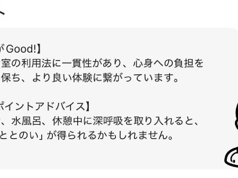 水風呂が20度前後だったのでそこはもう少し下げて欲しいなぁ。