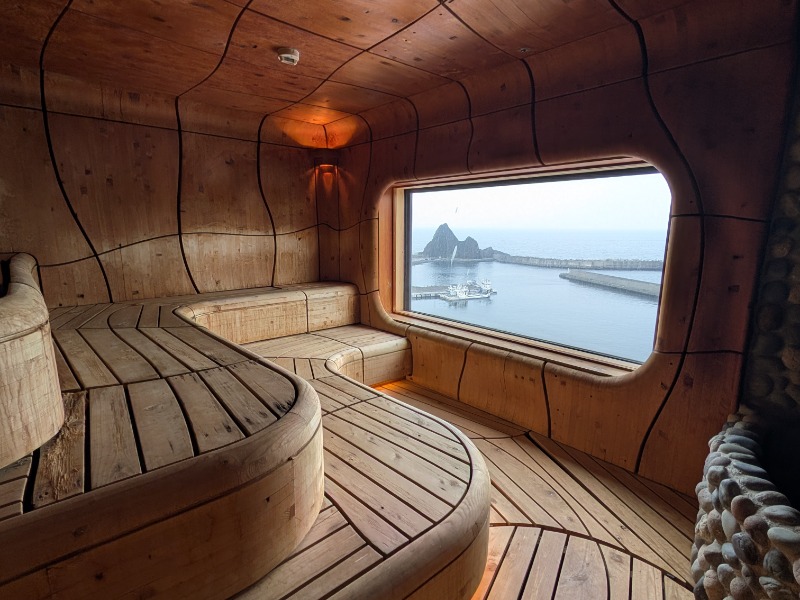 この時間男性側は『UNEUNA』となります。名前の通り座面がウネウネしております。大きな窓からはウトロ漁港がバッチリ見えます👍港を眺めながらゆったり入っているとオートロウリュ発動。いい感じに湿度が保たれています。