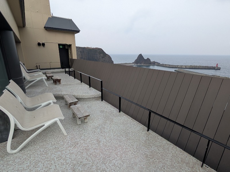 水風呂は15℃前後に保たれているので入りやすいですが、外気浴を考慮して短めに。階段を登り屋上のテラスへ。ウトロ漁港とウミネコを眺めながらの外気浴が楽しめます🤗この日は風が強く、バスタオルを身にまといやり過ごしました。(前日のkikiでご一緒だった方はポンチョ持参で快適そうでした😅)