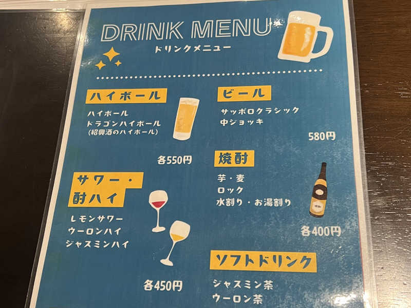ドリンクはこのメニュー表から選ばせてくれます。もちろんビール🍺やっぱり生は正義🙌