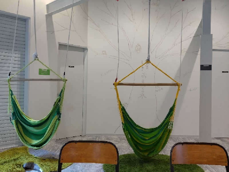 休憩スペースは、内風呂スペースには、インフィニティチェア2脚とととのいイス2脚とだらんとくつろげるメッシュイスが2脚ある。