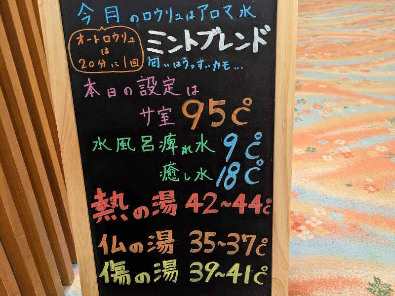 00分ロウリュ、20分、40分、00分ロウリュの4セットがベスト。1時間半くらいサウナ、風呂つかったりしてゆったりな2時間。