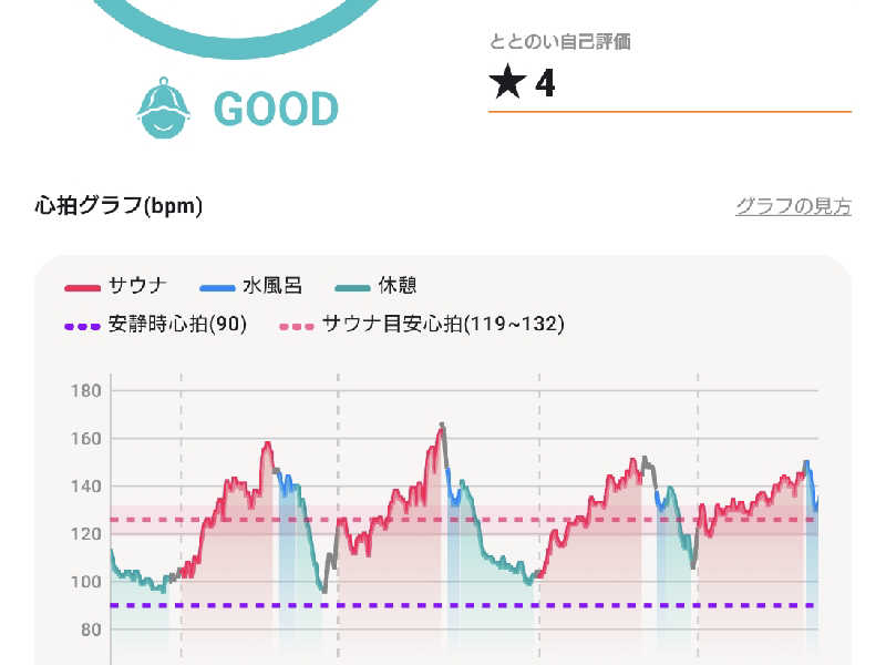 温度は75度と低めだが、オートロウリュが毎時30分である為湿度高く体感温度は90度近く感じました。