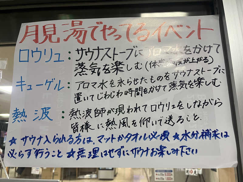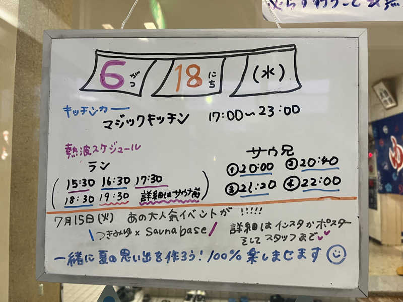 15:30〜18:30まで4回熱波・1時間刻みなのはいいんだけど、各回の熱波終わったら男湯・女湯の清掃に入りテキパキと手際よく仕事をこなしていく。