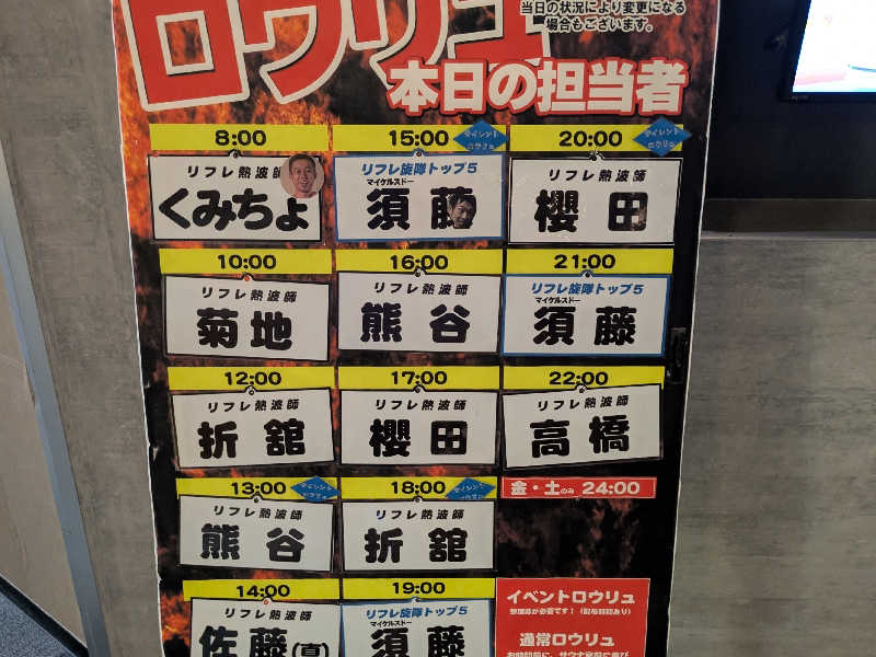 前日からカプセルルームに宿泊していて、滞在可能な時間は18時頃まで。ロウリュは8時から17時まで7回受け、滞在可能な時間帯に熊谷さんがサイレントと通常ロウリュの2回担当しますので、13時のサイレントロウリュはパスしました。