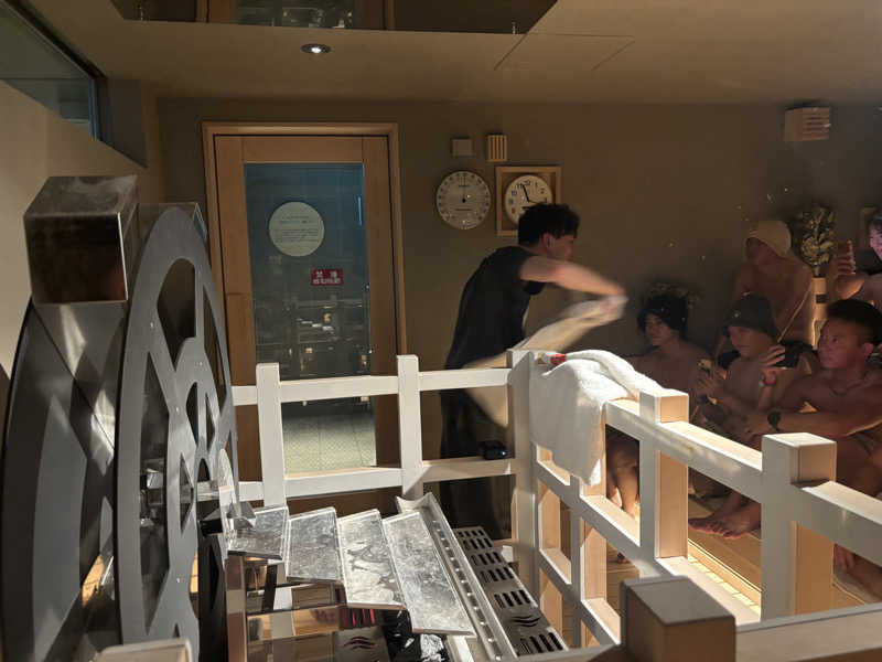 17時はカッシーロウリュ🔥仕事終わりのぺぺ君も参加🔥前半からアロマ多め🔥最下段が空いておらず2段目で悶絶🔥🥵💦団扇で軽く仰ぐだけでも熱々🔥そんな中での冷水サービスは気持ちいい☺️給水タイムを挟んで後半は激アツ🔥最下段に移動💨カッシー君がニコーリフレに行った際に柴野君に見つかりセンチュリオンはブロアーがあることにジェラシーを感じていたエピソードを受けて今回はブロアーは使わないで団扇のみの熱波🔥結果的に言うと火傷級の熱さ😱💦🔥カッシーのロウリュは結局熱い❗️😱💦🔥全身あまみが凄すぎる❗️😳
