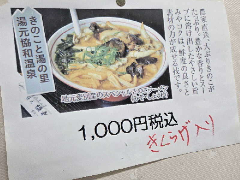 今回いただいた地元愛別産スペシャルきのこラーメンは、きのこの旨味が溶け出した贅沢な一杯!ぜひ、温泉とセットでご賞味ください🍄