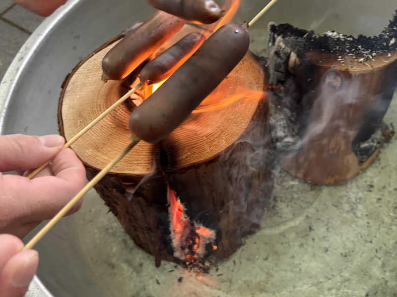 浴場とは一変して明るく、切株があったりと山小屋に居る雰囲気☺️