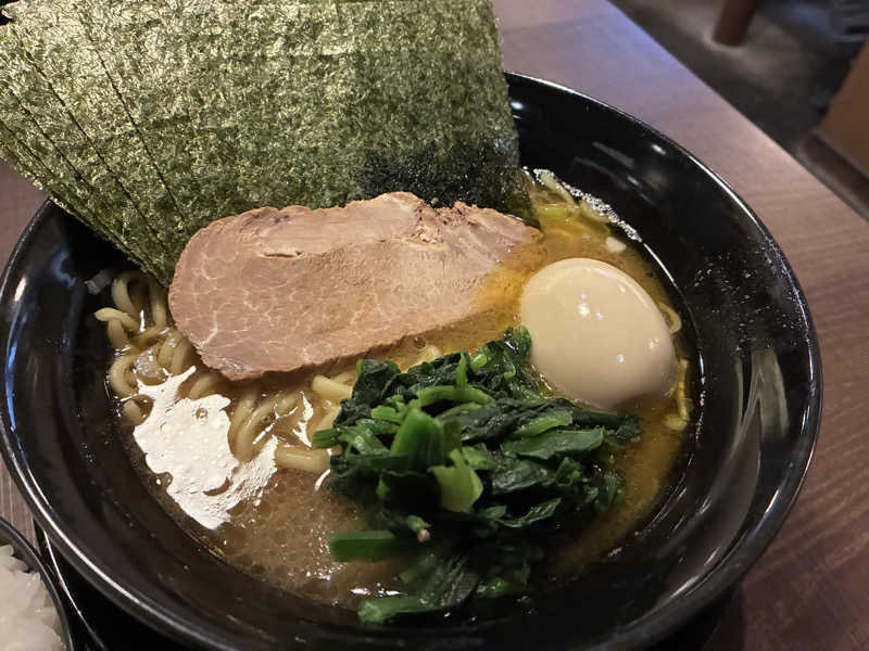 サ活後は、家系ラーメンの「こたん家ラーメン」を固さふつう、味の濃さふつう、脂少なめで注文。