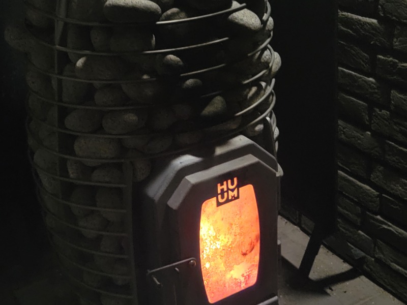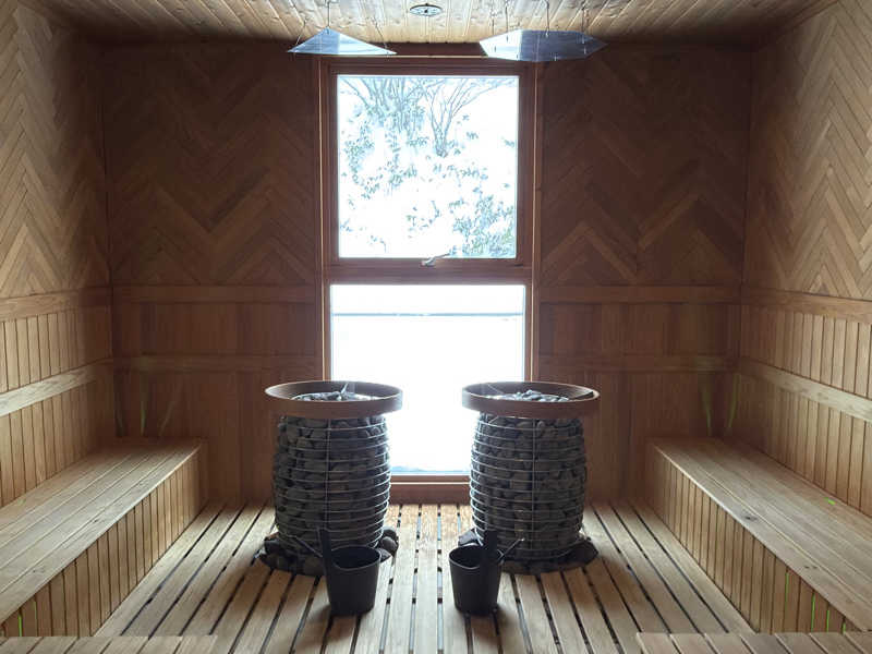 一昨日、昨日に入ったサウナ室より若干広く感じました。熊が彫刻された木材ボタンを押すとセルフロウリュのバケツに水が補充されるシステムにお洒落だな〜と感じました。