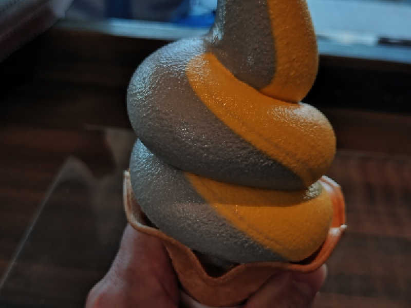 レストランにスウィーツ系無いみたいなので帰りにあびら町の道の駅よってかぼちゃソフトともくもく(機関車の煙のイメージらしいす)ソフトのミックス食べたけど、牛乳臭い。無理(全部喰ったけど)。