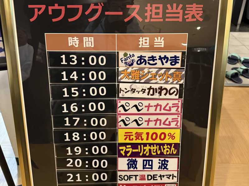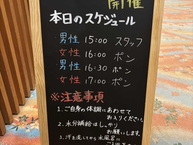本日のギャラクシーロウリュは13時ファンタジスタあきやまロウリュに初参加🔥ぺぺ君情報によると最近一本になったばかりの新人らしい😮ハルビアとメトス交互にアロマ投入で団扇で時間をかけてじっくりと熱波🔥13時最初のロウリュ🔥サウナ室の室温も高めなので汗が噴き出る💦そして最後は両方同時にロウリュしてから団扇で個別に7回熱波🔥しっかり汗を流してフィニッシュ❗️