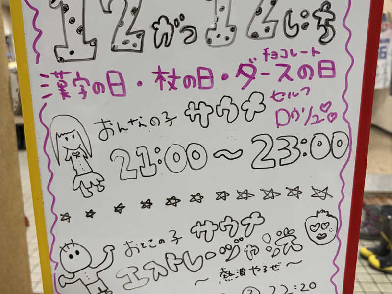 寒い🥶‼️今日は一日中氷点下➖5℃以下!早く暖まりたくて午後6時40分入場。こんなに寒いのに別海町民は暖まりたくないのだろうか?それとも皆んな忘年会に行ってしまったのだろうか?兎に角駐車場🅿️はガラガラ。下駄箱の履き物は極端に少なく、脱衣所のカゴ🧺は数えてみたら七つ。ワタクシを入れて八つ。案外入ってるなと思ったら、自衛隊の兵隊さん🪖だったようであっと言う間に5人退去。残ったのはワタクシとノーサウナーのヒデオと知らないオジサンの3人。すぐにサウナ怪人N村さんが入って来たけど、それでも4人。淋し過ぎる!
