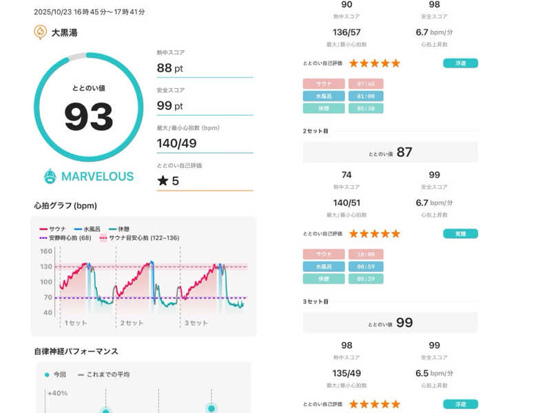サウナ94℃ 7分 水風呂18.5℃1分 外気浴7分 屋内休憩1分 給水