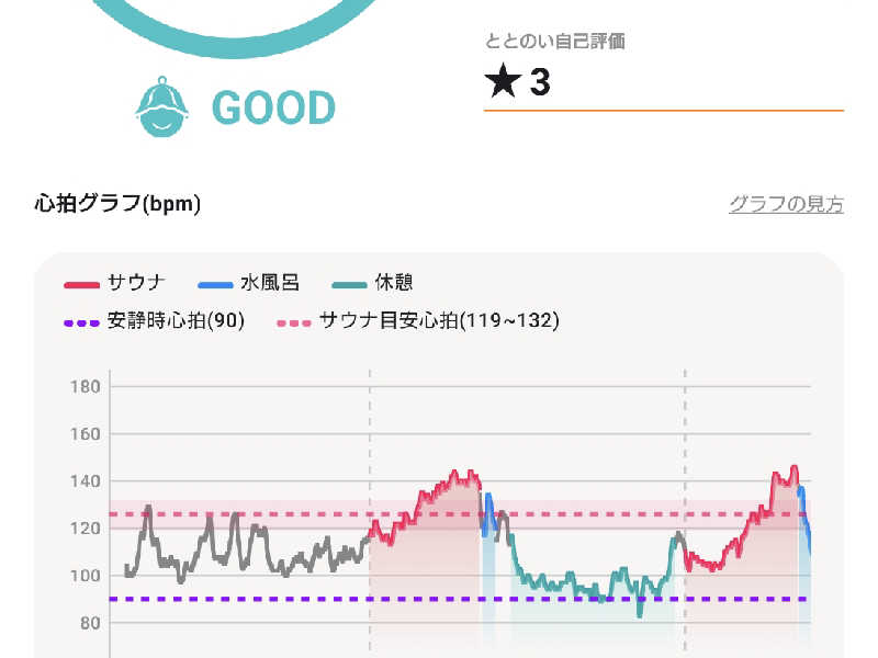 今日はととのいスペースで話しながらの整いだったので、サの国の数値は思ったより上がらずでしたが、発汗は今日も好調で1500g減の結果でした。