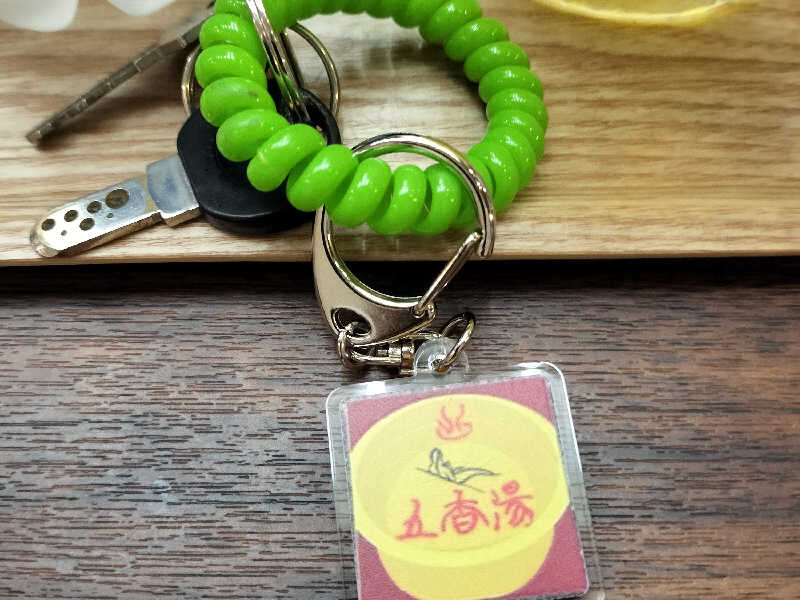 温泉ガチャのキーホルダーが潰れて、グリーンのお風呂用クルクル輪っかだけがのこったので、五香湯キーホルダーを合体させました。