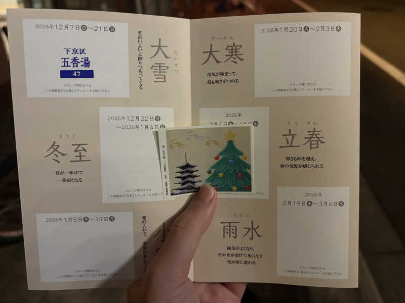 松井京都市長のXの投稿で、京都市の二十四節気湯めぐりスタンプラリーが始まった旨を知ったのですが、この企画のすごいところは、約1年間にわたり企画が続くということで、京都市と京都浴場協同組合の気合を感じる企画となっています。また企画自体も、京都らしいといいますか、二十四節気に合わせたステッカーシールを集める形式のようです。大阪銭湯のストリートファイターとのコラボ企画も面白かったですが、各地のスタンプラリーの違いを面白く感じています。
