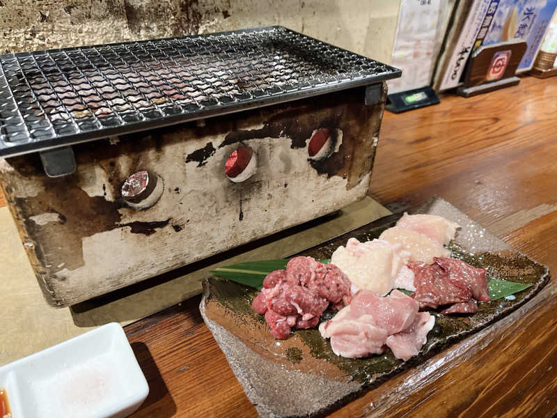 生ビール、鶏焼き5種盛り(きも、もも、むね、かわ、せぎも)、明太子ポテサラ、黒獅子(京都・黄桜)、鶏焼き追加(ぼんじり、せせり、こころのこり)、繋(福知山)