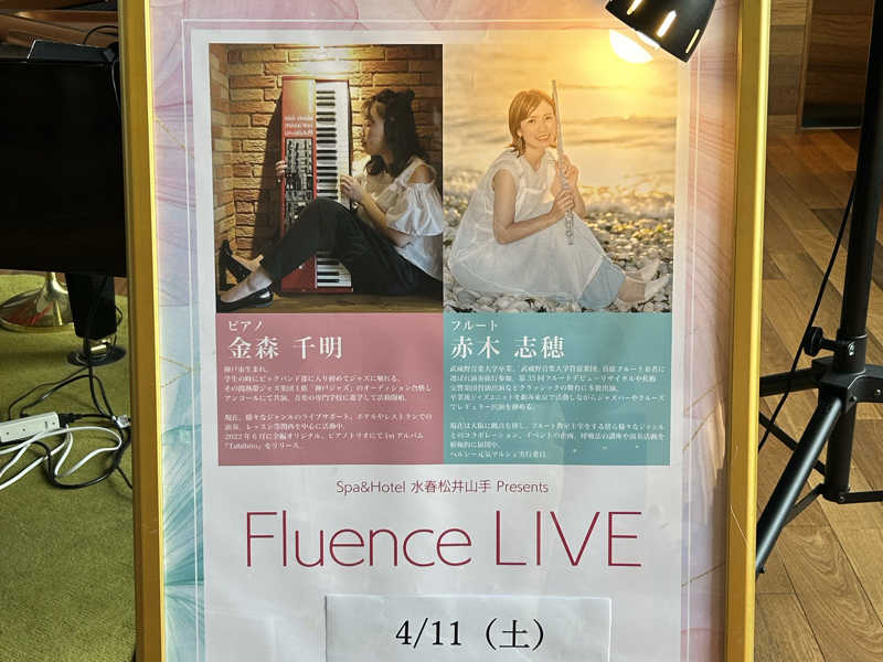 帰る時間の18時00分〜ピアノとフルートの生演奏あり。こういうところが「SPA&HOTEL 水春 松井山手」の素敵なところ。