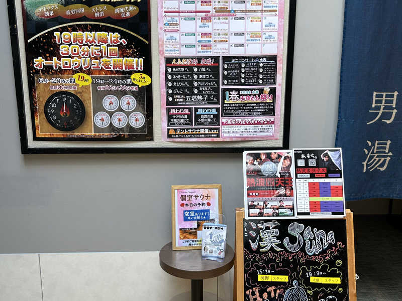 サウナの利用は「ロウリュサウナ」の1ヵ所のみ。時々行っている「東香里湯元水春」他にある「瞑想サウナ」はなし。サ室の温度計は約92℃。毎時00分からのオートロウリュにより湿度は高くしっかりと熱い。オートロウリュは15時00分〜と16時00分〜の2回参加。ちなみに15時30分〜のスタッフによるアウフグースイベントがあったのですが事前のチェックができておらず参加できませんでした。